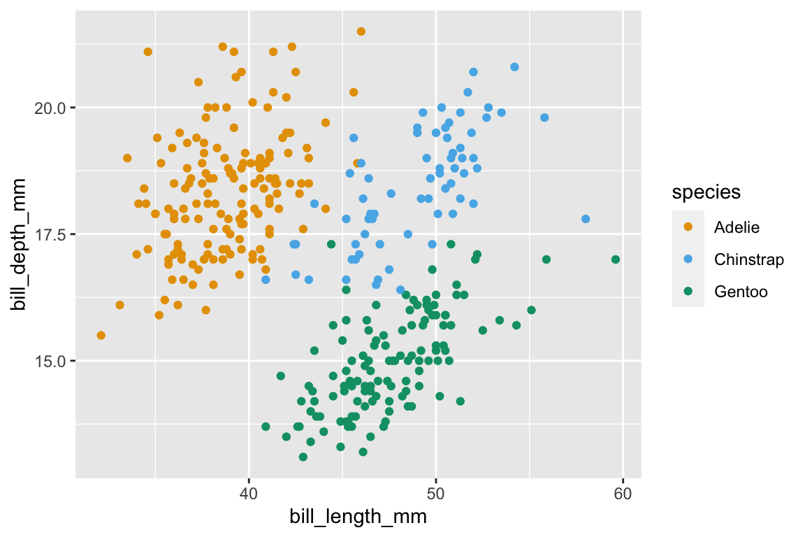 ```{r} ggplot(penguins, aes(x = bill_length_mm, y = bill_depth_mm, color = species)) + geom_point() + scale_color_OkabeIto() ```